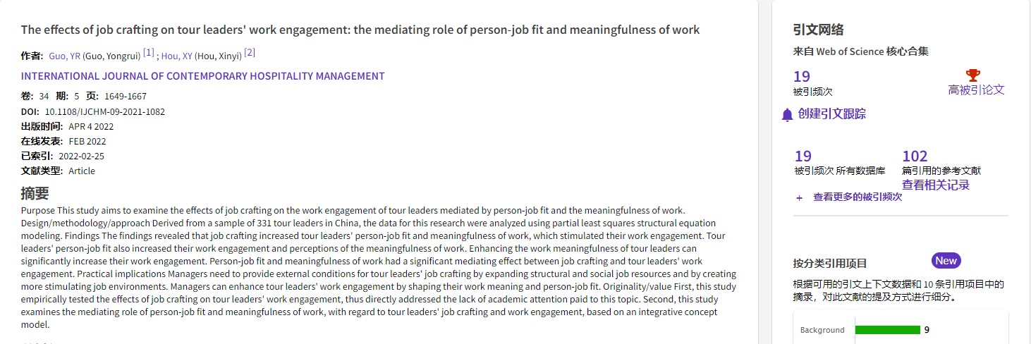 根据2023年1月Essential Science Indicators (ESI)数据库最新统计数据显示,天游官网郭永锐教授发表于国际接待业顶级期刊International Journal of Contemporary Hospitality Management,题目为“The effects of job crafting on tour leaders’ work engagement: the mediating role of person-job fit and meaningfulness of work”的论文被ESI收录为高被引论文。International Journal of Contemporary Hospitality Management是国际旅游、酒店及服务管理学界公认的顶级期刊之一,最新影响因子为9.321,为JCR一区期刊。该研究得到国家自然科学基金(41871126,41801135)等项目的资助。