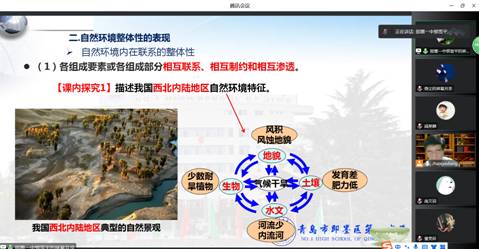 林老师从深度学习定义、“双减”形势分析开始。结合自己的教学经验挖掘教材,从《日本》一节的教材教学内容设置,日本国花——樱花图片及活动探究,引入到中国的樱花等花期的知识和原理的小组探究:湖南油菜花开花规律及原因;华北平原小麦的收割规律及影响因素;进入深度学习的过程;又结合《中国的疆域》一节课的教学,林老师展示了视频《航拍中国》,通过视频的生动介绍,让学生感受中国之地大物博;从观课体会谈我国冬夏季气温的分布特点研讨地理深度学习的策略,候鸟旅游——海南岛是冬季候鸟旅游的热门地点,这与我国冬季气温分布有什么关系呢?抛出“你妈喊你穿秋裤”的问题情境,通过全国各地的“避冬”锦囊,学生已然深刻认识到我国冬季气温的分布特点——冬季我国气温差异大,南方温暖,越向北,气温越低。夏季气温分布特点则是执教教师利用“热如蒸饺之全国焖蒸预警地图”的展示,进入“你热哭了吗?”的情景问题,通过展示夏季火焰山的温度、深圳学子汗流浃背的图片和火炉城市,抓住学生思维,由此,引领学生进入我国夏季气温分布特点的探究热情中。通过环环相扣的问题情境的引领,引发学生强烈的探究兴趣,在兴趣引导下,爱学、乐学、主动学。
