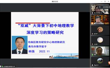 青岛市市南区教育研究中心韩强老师做“双减”大背景下初中地理教学深度学习的策略研究讲座。韩强老师是青岛市教学能手、山东省优质课二等奖的获得者;是山东省义务教育必修地方教科书《生态环境教育》八年级教材的主编、《蓝色家园》初中教材编委。韩老师先是解读了“双减”政策和深度学习,运用学习的金字塔建模形象的解释了浅层学习和深度学习的差异;再通过2022义务教育课程标准与2011年课程标准进行了对比解析,多层面进行了大背景的形势分析,让与会老师与同学们了解当前任务之紧迫、形势之必然。