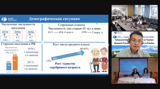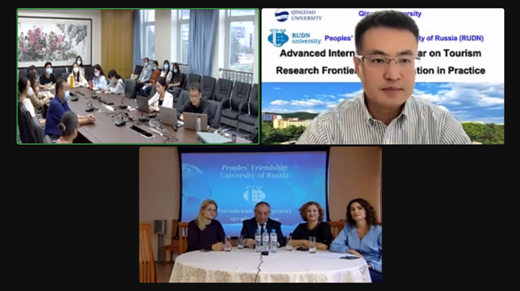 为进一步促进国际交流与合作,推动学院的国际化办学进程,天游ty8检测中心官方登录与俄罗斯人民友谊大学(Peoples’ Friendship University of Russia)酒店商务与旅游学院于2022年9月16日联合举办了主题为“旅游研究前沿和实践创新”的线上学术交流研讨会。研讨会由天游ty8检测中心官方登录潘永涛副教授主持,党委书记刘善东、院长助理赵玉宗等多位老师和在校研究生参加了学术交流。