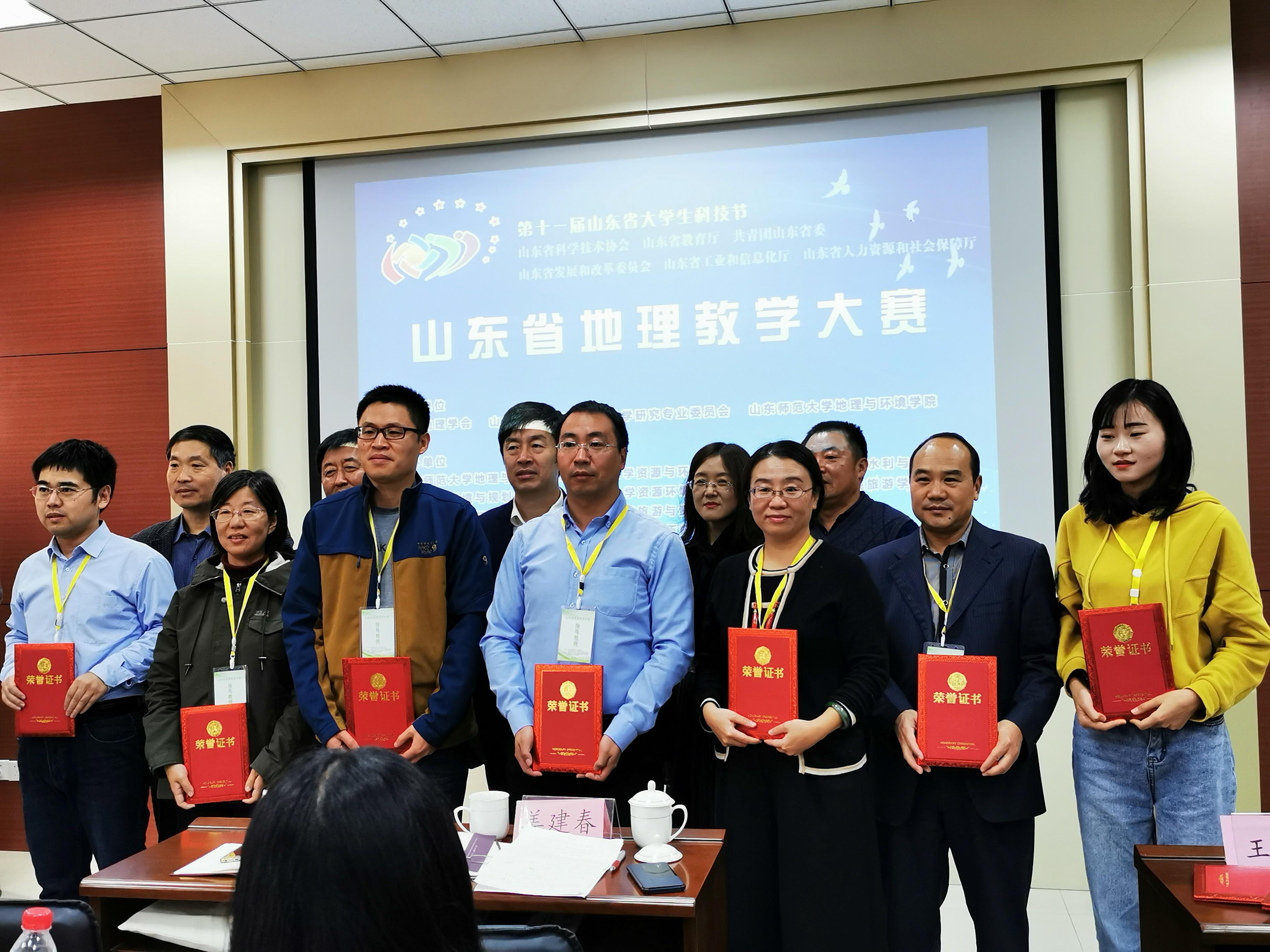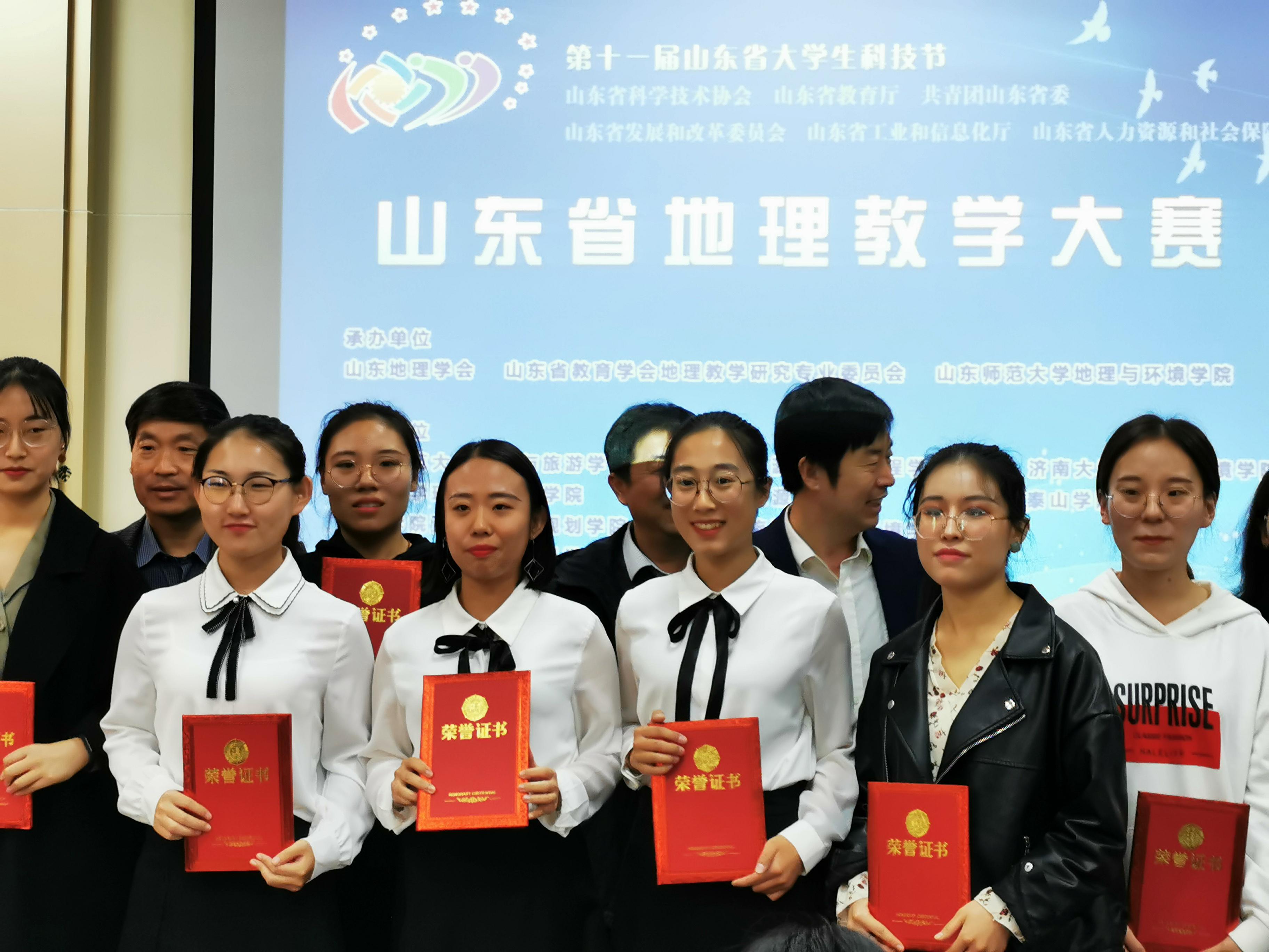 2019年10月25-27日在济南山东师范大学举办的第十一届山东省大学生科技节山东省地理教学大赛圆满落幕。天游ty8检测中心官方登录表现出色,共获得特等奖1项,一等奖3项,二等奖1项的好成绩。孙宏霞,徐雪获优秀指导教师称号。