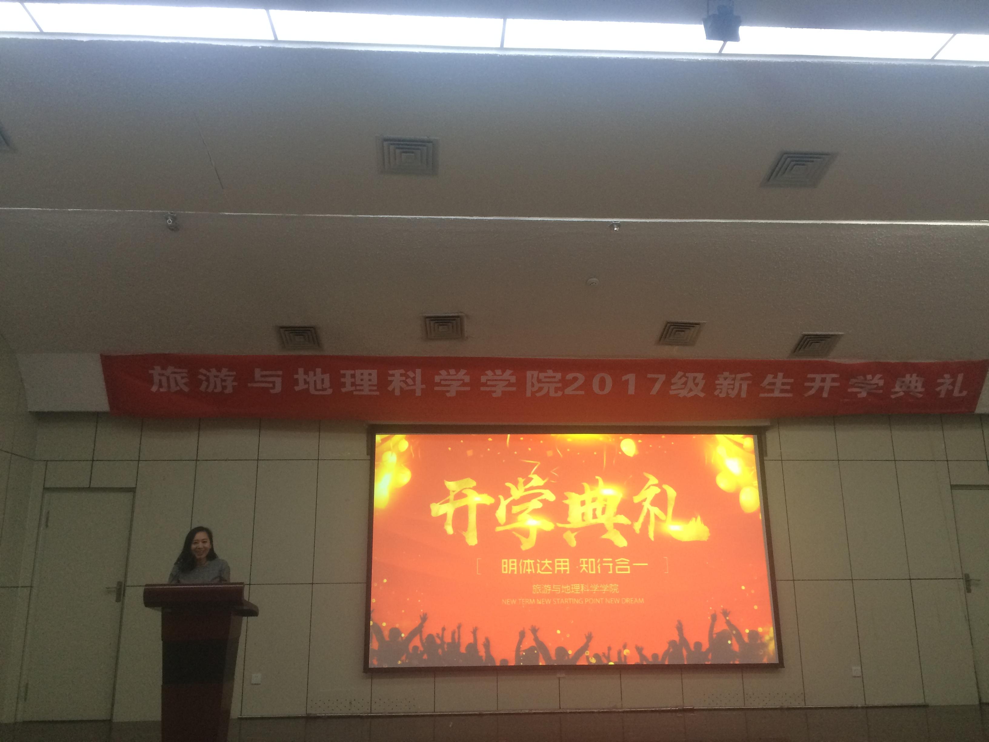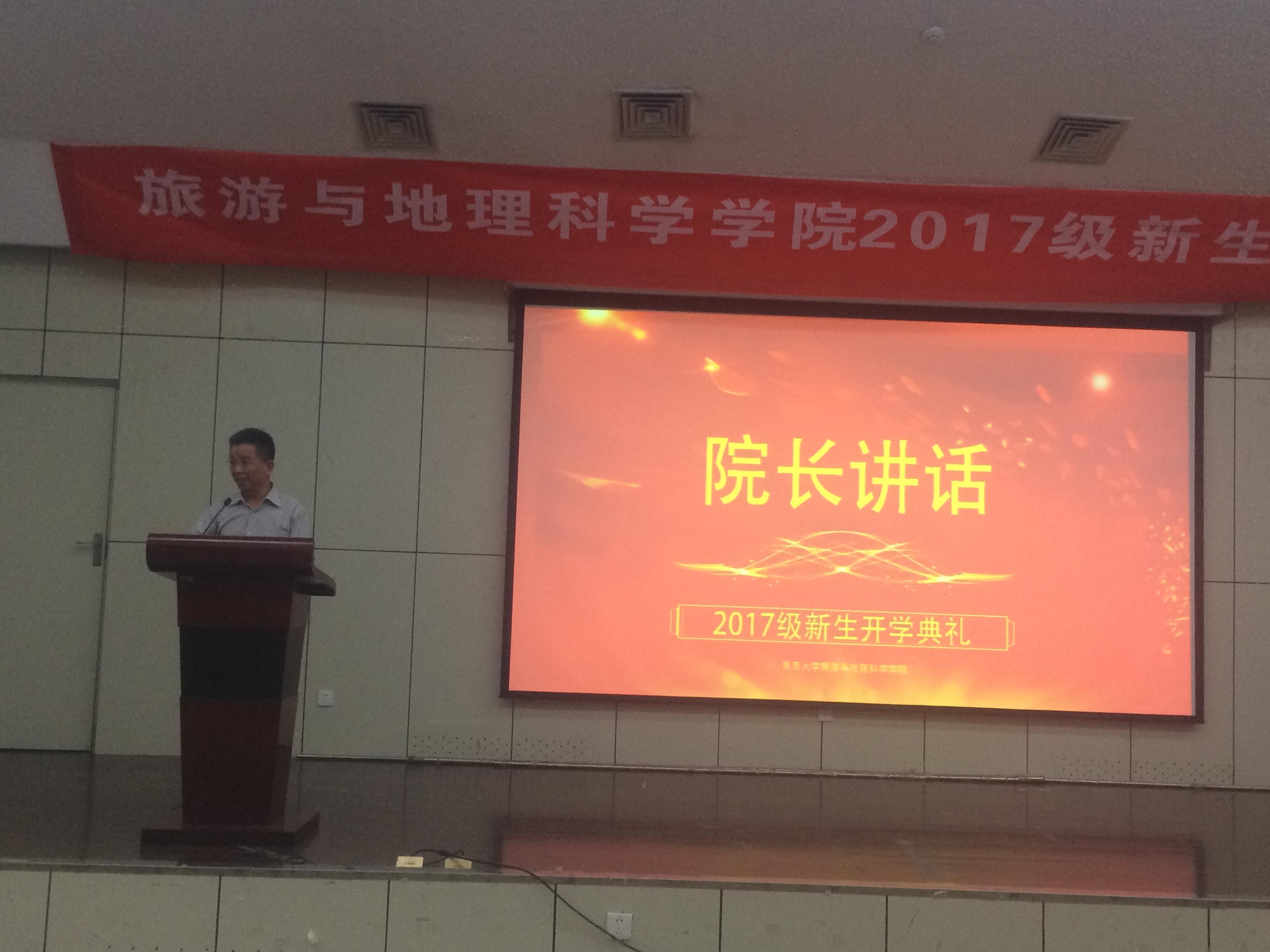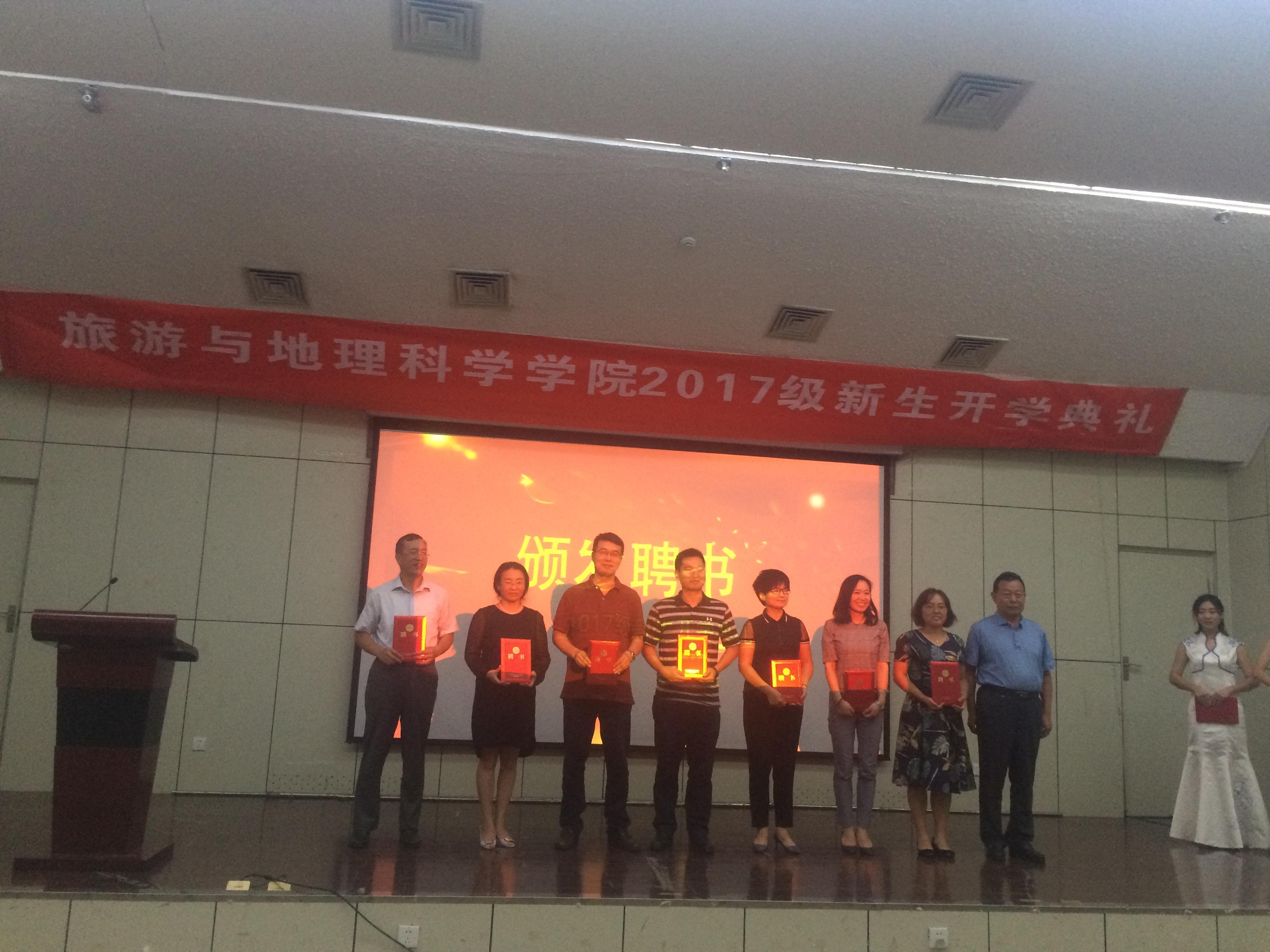 开学典礼在党委副书记孙志军的主持下拉开帷幕。首先,副院长耿庆汇分系别介绍了学院的教职工人员,使17级新生对本学院的教学情况有了初步的了解。接下来,酒店管理系教师于岩平、14级旅游管理专业学生邱天斌、17级旅游管理专业学生李高展分别作为代表进行发言。教师代表于岩平通过分享自己身边的故事,告诉同学们要崇尚务实、敢于孤独,努力培养自己的执行力,做一个内心丰盈、心灵澄澈的善良人。老生代表邱天斌告诫同学们谨记“明德、博学、守正、出奇”的校训,做一个德才兼备的旅地人。新生代表李高展代表全体新生致谢,他希望新生尽快适应大学生活,树立理想,踏踏实实走好大学四年。随后党委书记刘善东向17级新生班主任颁发聘书。最后,院长马波以“前10%的含义与前5%的理想”为题发表演讲。他鼓励同学们学会独立生活、独立思考,记住、理解并践行院训“明体达用,知行合一”,同时,衷心祝愿全体新生心怀梦想,砥砺前行。