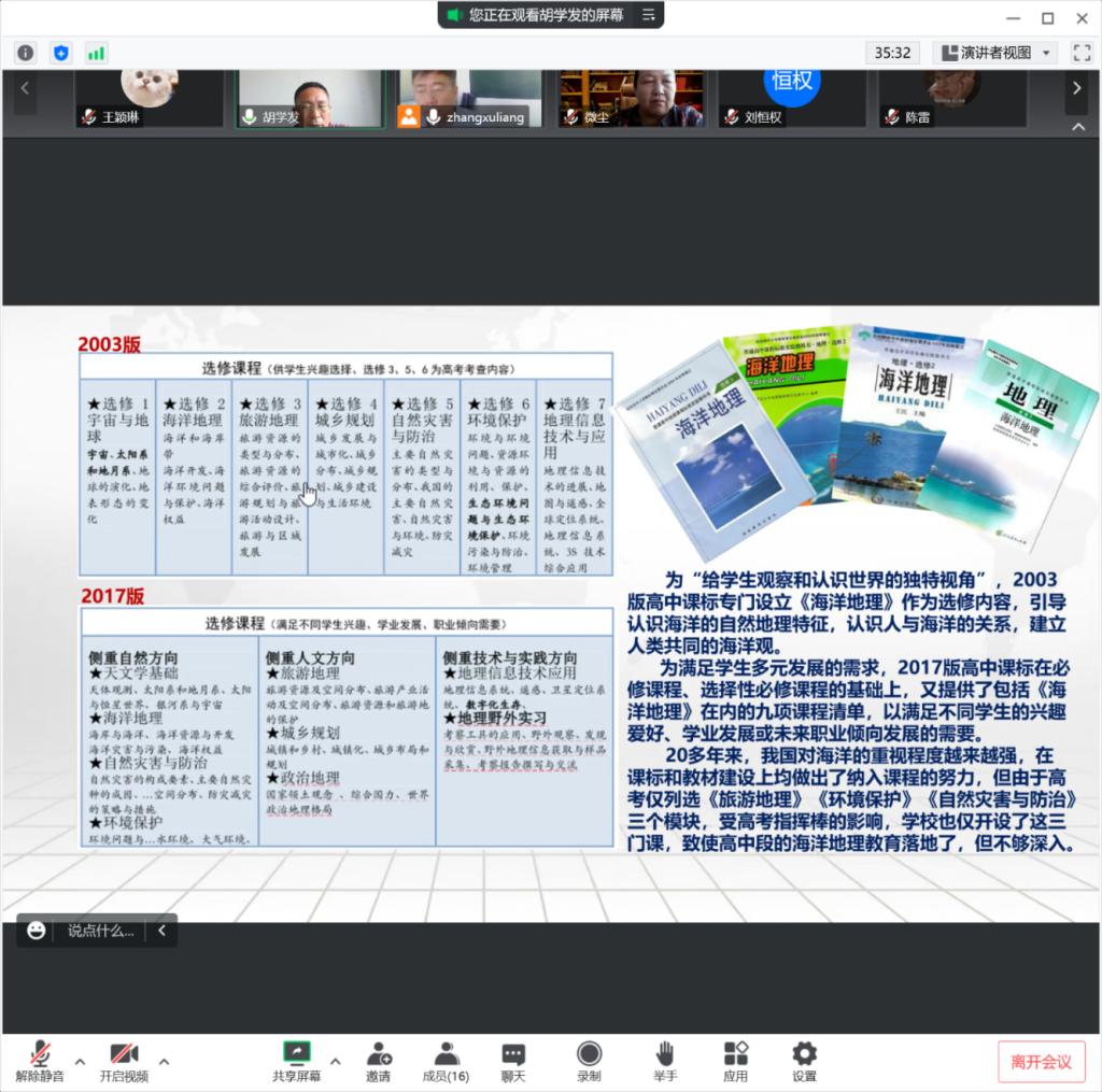 胡老师强调海洋教育应在经略海洋思想的指导下进行,聚焦课标要求实施教学,促进学生知识迁移,形成学科思维以培养学科素养,帮助学生认识海洋、理解海洋、关心海洋和经略海洋。胡老师根据自身经验,给我们介绍了灵活多样的教学方式,其中包括问题式教学和大单元教学,最后给我们讲述了古往今来海洋对于我国历朝历代发展的重要性,强调应大力开展海洋教育的专题教研活动,多探讨、组织教学研讨会。