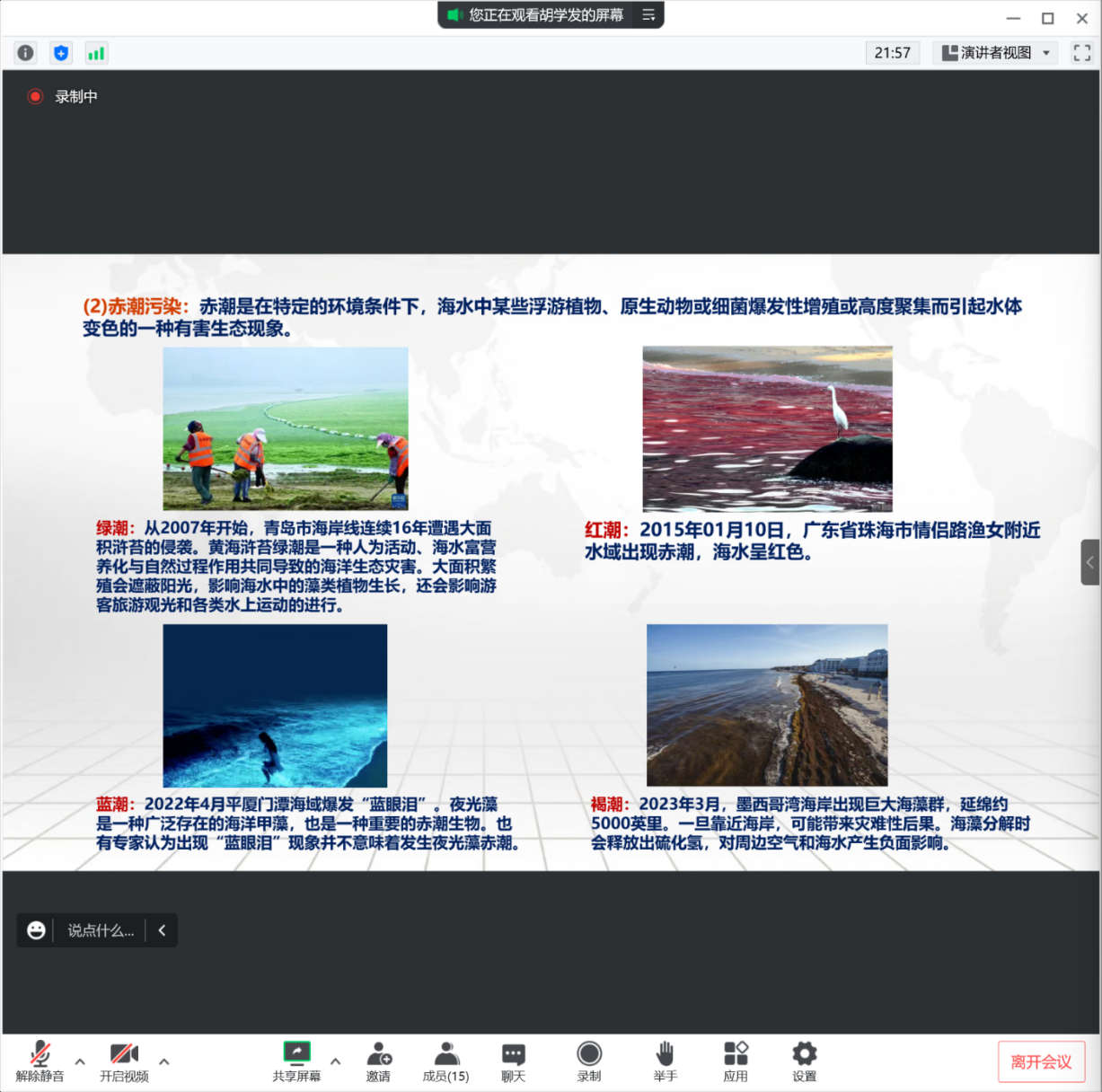 胡老师利用各种海洋生态图片,介绍了海洋垃圾的危害性、海洋生态爆发产生的赤潮类型、海洋常见的石油污染、噪音污染以及海洋物种病变和锐减等现象。