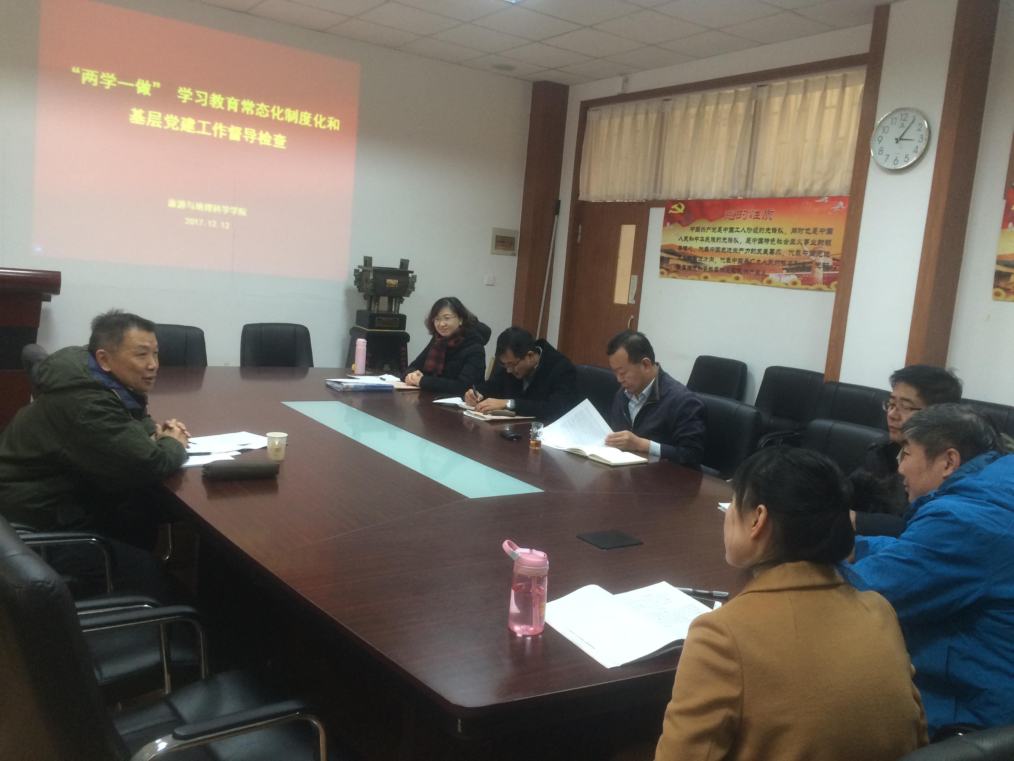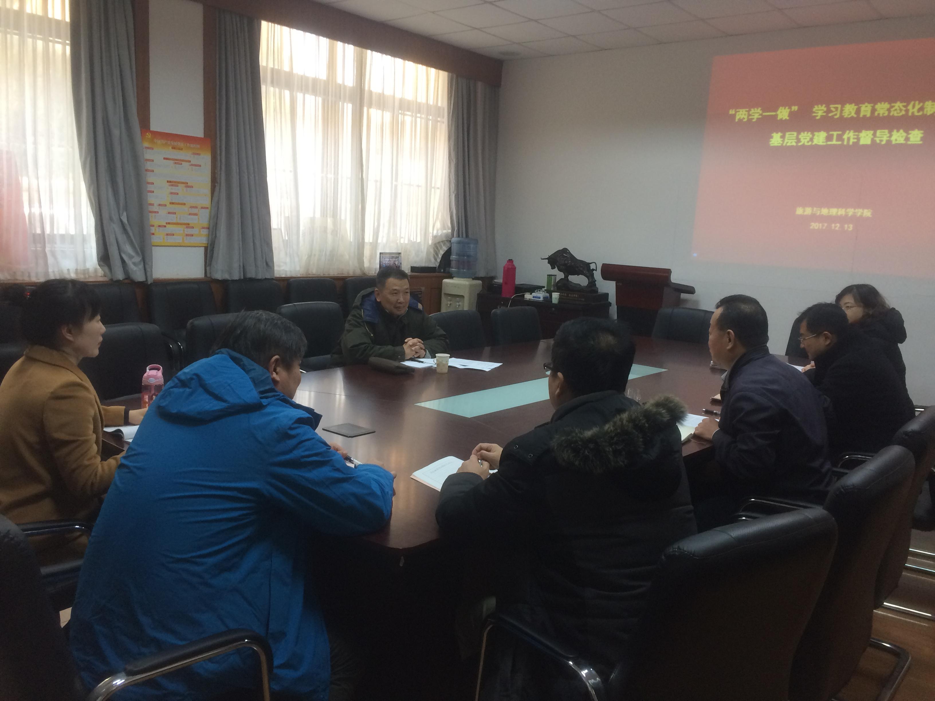 2017年12月13日下午3时,学校督导组成员徐伟光到天游ty8检测中心官方登录督导检查推进“两学一做”学习教育常态化制度化和基层党建工作,学院党委书记刘善东、学院的六位支部书记参加了会议。